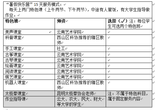 服務內容:每天四節(jié)特色課+午餐+作業(yè)輔導。