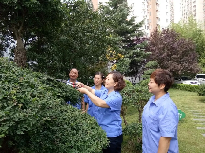 仝洋(右二)為班組職工講解并示范苗木修剪。