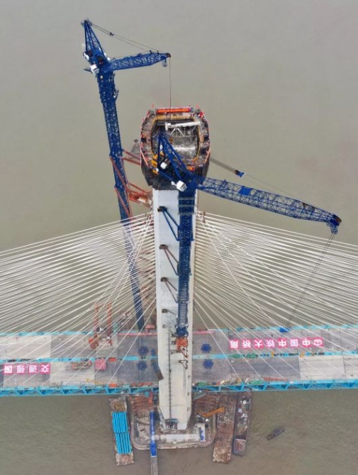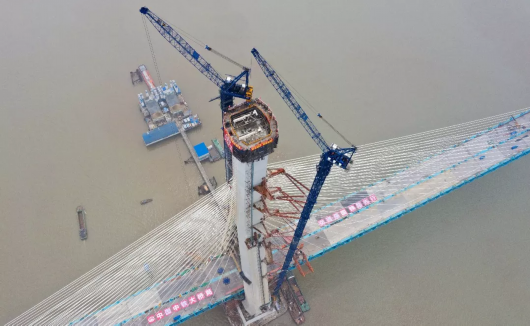 27日,滬通長江大橋南主塔順利封頂。至此,該橋兩座高達330米的主塔全部建成,標志著世界最大跨度公鐵兩用斜拉橋建設(shè)取得了關(guān)鍵性進展。