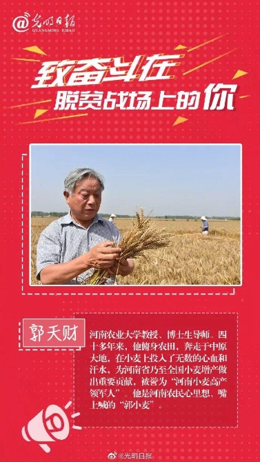 河南農(nóng)業(yè)大學(xué)教授、博士生導(dǎo)師。四十多年來,他俯身農(nóng)田,奔走于中原大地,在小麥上投入了無數(shù)的心血和汗水,為河南省乃至全國小麥增產(chǎn)做出重要貢獻,被譽為“河南小麥高產(chǎn)領(lǐng)軍人”。他是河南農(nóng)民心里想、嘴上喊的“郭小麥”。