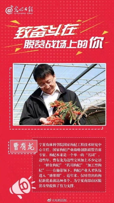 寧夏農(nóng)林科學(xué)院國家枸杞工程技術(shù)研究中心主任、國家枸杞產(chǎn)業(yè)戰(zhàn)略創(chuàng)新聯(lián)盟首席專家。枸杞本來是一個單一的“名詞”,這些年,曹有龍為這些寶貝加上不少定語:“鮮食枸杞”“藥用枸杞”“加工型枸杞”……在他帶領(lǐng)下,枸杞產(chǎn)業(yè)人才隊伍進入“盛果期”,近年來,僅培育出的枸杞新優(yōu)系就達(dá)50多個,為寧夏南部山區(qū)脫貧攻堅提供了有力支撐。