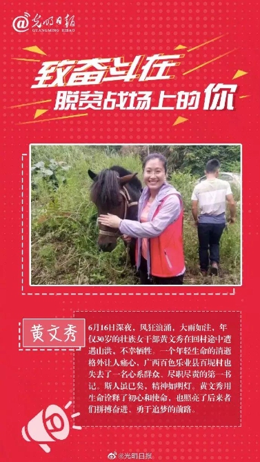 6月16日深夜,風(fēng)狂浪涌,大雨如注,年僅30歲的壯族女干部黃文秀在回村途中遭遇山洪,不幸犧牲。一個年輕生命的消逝格外讓人痛心,廣西百色樂業(yè)縣百坭村也失去了一名心系群眾、盡職盡責(zé)的第一書記。斯人雖已矣,精神如明燈。黃文秀用生命詮釋了初心和使命,也照亮了后來者們拼搏奮進、勇于追夢的前路。