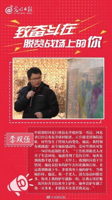 中聯(lián)部駐河北行唐縣東井底村第一書記,河北省已經(jīng)宣布東井底村脫貧,正在接受國務(wù)院驗收。村里發(fā)生了特別大的變化,他說:我特別有成就感!最令他最感動的,是村里幫扶對象——74歲的趙銀拴老人?!肮ぷ鹘M幫助老人改善了生活環(huán)境,他感受到了黨的關(guān)懷,每次見到我都千恩萬謝。一天早上,我到田間看干旱情況,他趕著拉水的驢車去村北灌溉莊稼,老遠(yuǎn)看到我就下車,非要我坐上他的驢車。當(dāng)我婉拒時,他說,我一個老人,沒有辦法回報更多,你坐上我的驢車載你一程,讓我心里舒服。我只好含著淚水坐上驢車,他牽著驢車載了我一百多米,才依依不舍看著我走遠(yuǎn)?!?/p>