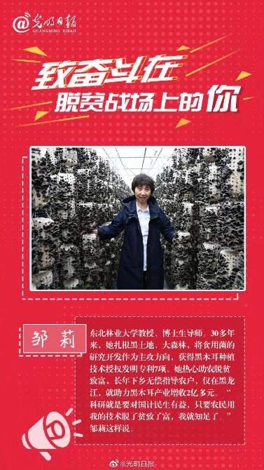 東北林業(yè)大學(xué)教授、博士生導(dǎo)師。30多年來,她扎根黑土地、大森林,將食用菌的研究開發(fā)作為主攻方向,獲得黑木耳種植技術(shù)授權(quán)發(fā)明專利7項。她熱心助農(nóng)脫貧致富,長年下鄉(xiāng)無償指導(dǎo)農(nóng)戶,僅在黑龍江,就助力黑木耳產(chǎn)業(yè)增收2億多元。“科研就是要對國計民生有益,只要農(nóng)民用我的技術(shù)脫了貧致了富,我就知足了?!编u莉這樣說。