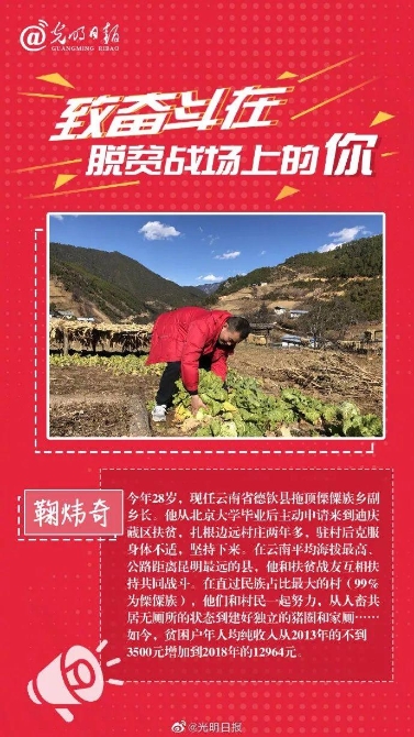 今年28歲,現(xiàn)任云南省德欽縣拖頂傈僳族鄉(xiāng)副鄉(xiāng)長。他從北京大學(xué)畢業(yè)后主動申請來到迪慶藏區(qū)扶貧,扎根邊遠(yuǎn)村莊兩年多,駐村后克服身體不適,堅持下來。在云南平均海拔最高、公路距離昆明最遠(yuǎn)的縣,他和扶貧戰(zhàn)友互相扶持共同戰(zhàn)斗。在直過民族占比最大的村(99%為傈僳族),他們和村民一起努力,從人畜共居無廁所的狀態(tài)到建好獨立的豬圈和家?guī)缃?,貧困戶年人均純收入?013年的不到3500元增加到2018年的12964元。