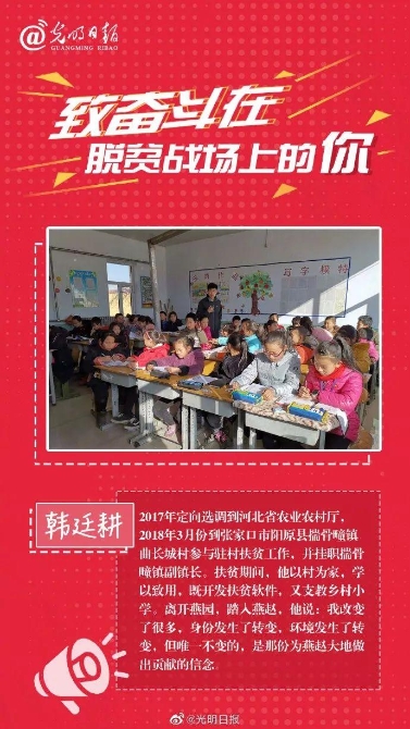 2017年定向選調(diào)到河北省農(nóng)業(yè)農(nóng)村廳,2018年3月份到張家口市陽原縣揣骨疃鎮(zhèn)曲長城村參與駐村扶貧工作,并掛職揣骨疃鎮(zhèn)副鎮(zhèn)長。扶貧期間,他以村為家,學(xué)以致用,既開發(fā)扶貧軟件,又支教鄉(xiāng)村小學(xué)。離開燕園,踏入燕趙,他說:我改變了很多,身份發(fā)生了轉(zhuǎn)變,環(huán)境發(fā)生了轉(zhuǎn)變,但唯一不變的,是那份為燕趙大地做出貢獻的信念。