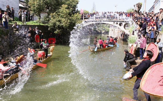 浙江“千萬(wàn)工程”以治理好涉及千家萬(wàn)戶的“關(guān)鍵小事”為切入口,掀起“垃圾革命”、“污水革命”、“廁所革命”,使廣大鄉(xiāng)村迎來(lái)翻天覆地的變化,再現(xiàn)天藍(lán)水清的美麗景象。圖為湖州市德清縣下渚湖街道塘涇村的村民舉行潑水祈豐年活動(dòng)。 浙江省農(nóng)辦供圖