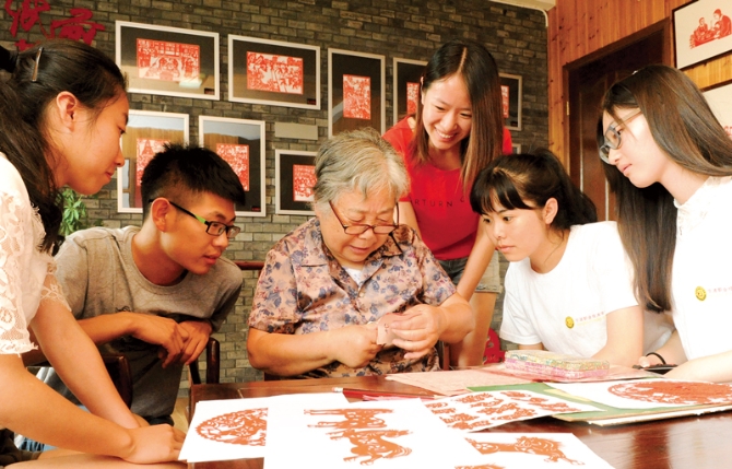 浙江“千萬(wàn)工程”啟動(dòng)以來(lái),在整治農(nóng)村人居環(huán)境的同時(shí),也大力加強(qiáng)農(nóng)村公共文化建設(shè),提高鄉(xiāng)村精神文化水平,全面提升農(nóng)民的獲得感、幸福感。圖為寧波市非物質(zhì)文化遺產(chǎn)傳承人在傳授剪紙藝術(shù)。 浙江省農(nóng)辦供圖