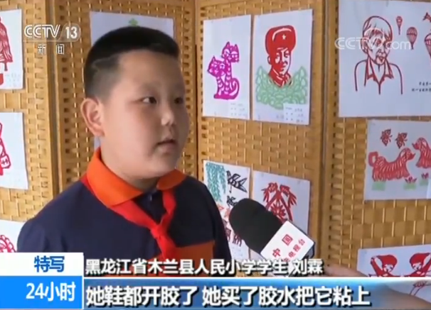 黑龍江省木蘭縣人民小學 學生 劉霖:她鞋都開膠了,她買了膠水粘上,感覺她很節(jié)約很偉大,很尊敬馬奶奶,我和我的同學包括我的老師,也一起以馬奶奶為主題剪了一些剪紙作品,這個就是馬奶奶自畫像。