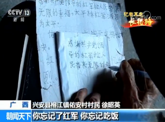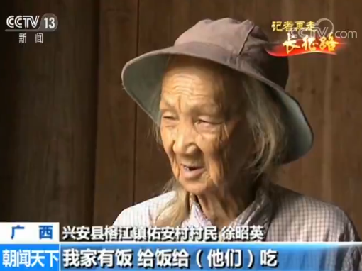 興安縣榕江鎮(zhèn)佑安村村民 徐昭英:忘記了紅軍就忘記了吃飯,忘記了吃飯你就餓死。如果一個人沒有天沒有地你踩在哪里?沒有天拿什么曬太陽?沒有山拿什么柴來燒?沒有地拿什么種菜去?你沒有房屋拿什么去躲雨?