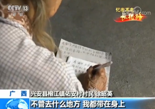 興安縣榕江鎮(zhèn)佑安村村民 徐昭英:我就是舍不得,我要抄到書(本子)上,我天天要看到。不管去什么地方,我都想放在身上。還沒寫好,我還要抄好一點。