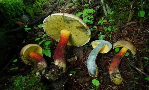 如松乳菇、紅汁乳菇掰開或劃傷后會流出乳汁,但卻是美味的食用菌。一些可食用的牛肝菌斷面會變成藍(lán)色,也是可食的。