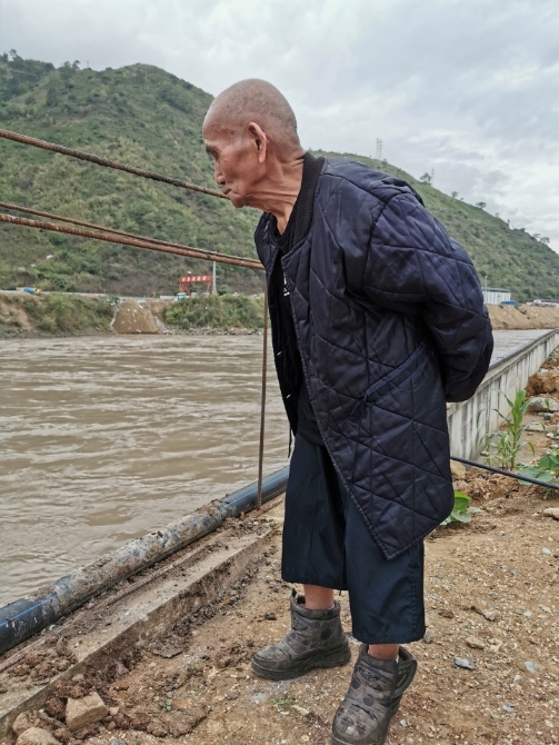 采訪(fǎng)結(jié)束后,裴海清說(shuō)想去江邊走走。于是,大家一起攙扶著他,慢慢走向江邊。在怒江邊,他佝僂著身體,眼睛循著江水望向遠(yuǎn)方。我們想,此刻,他是在想家吧!