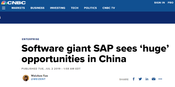 另據(jù)美國CNBC網(wǎng)站7月2日報道,德國軟件巨頭思愛普(SAP)公司認為中國市場有“巨大”的機遇,將尋求在中國大舉擴張。SAP總部位于德國沃爾多夫,在企業(yè)資源管理(ERP)軟件市場占有重要地位,是全球最大的企業(yè)應用軟件提供商之一。