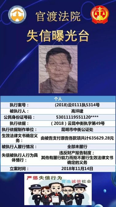 近日,記者從昆明市官渡區(qū)人民法院獲悉,昆明曝光一批失信者被執(zhí)行人名單,共20人。