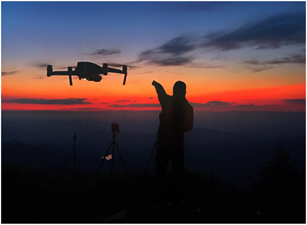 繞著盤山公路一路行至山頂,正好趕上天邊晚霞交相輝映,攝影大咖們紛紛拿出無人機(jī),捕捉夕陽金黃色的烙印。