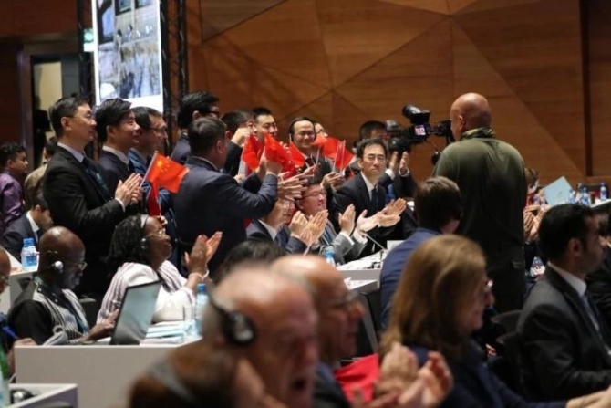 中國代表團(tuán)全體起立鼓掌,揮舞國旗相互祝賀,臉上洋溢著自豪和喜悅的笑容。多國代表也紛紛上前,送上誠摯的祝賀。