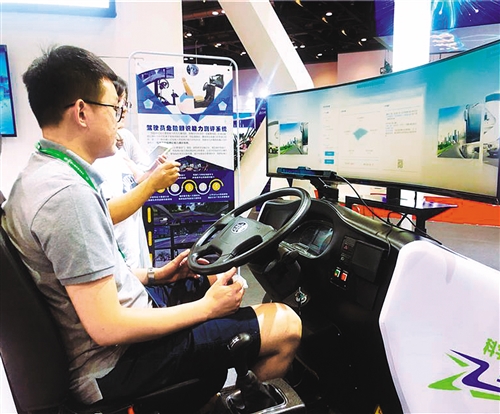 參觀者在2019年世界交通運(yùn)輸大會(huì)同期舉辦的交通科技博覽會(huì)上體驗(yàn)駕駛員危險(xiǎn)辨識(shí)能力測(cè)評(píng)系統(tǒng)。本報(bào)記者 郭靜原攝