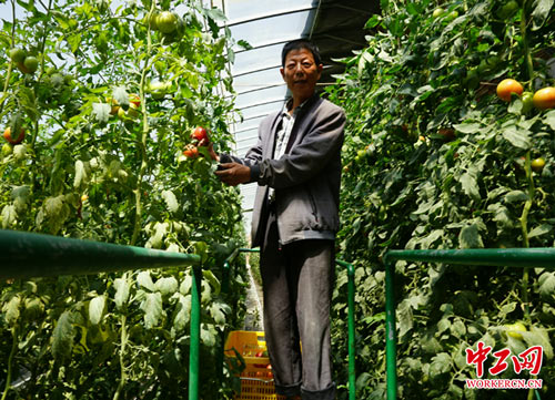 姚磨村蔬菜基地工人在采摘成熟的西紅柿
