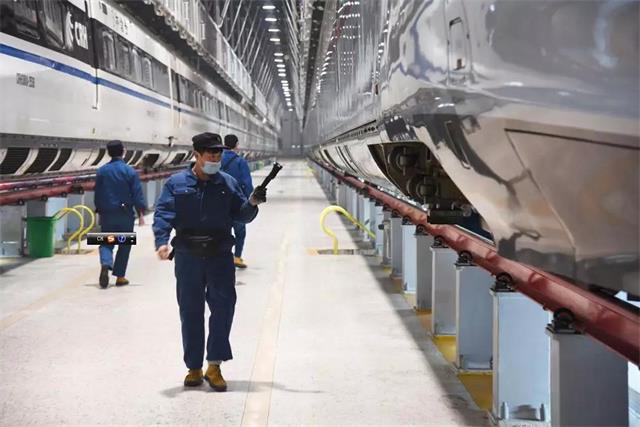 濟(jì)南東動(dòng)車所的檢修機(jī)械師在對(duì)一列復(fù)興號(hào)進(jìn)行檢查。(2019年2月12日攝)