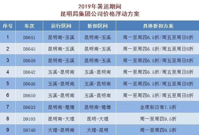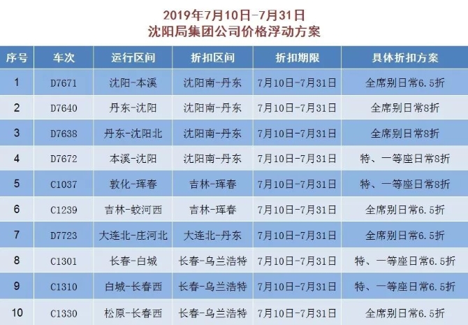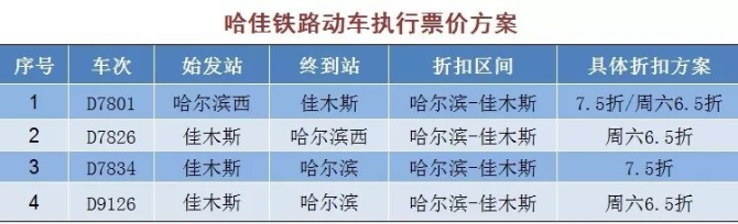 該票價方案執(zhí)行時間自2019年7月10日起至另行通知時止。除上述公布折扣動車外,哈佳鐵路其他動車組列車票價按公布票價9.47折執(zhí)行。