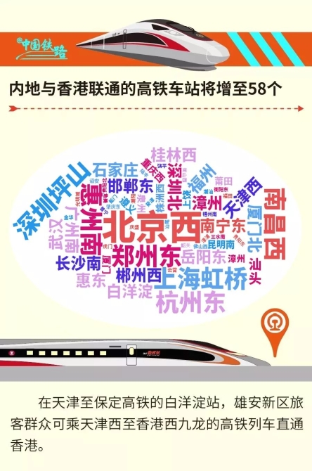 調(diào)圖后,更多內(nèi)地城市與香港將實(shí)現(xiàn)高鐵聯(lián)通。增開重慶西、天津西、南寧東、肇慶東、汕頭至香港西九龍站動車組列車,增加遵義、貴陽東、白洋淀、邯鄲東、岳陽東、衡陽東、梧州南、佛山西等站辦理直通香港客運(yùn)業(yè)務(wù),內(nèi)地與香港聯(lián)通的高鐵車站增至58個。在天津至保定高鐵的白洋淀站,雄安新區(qū)旅客群眾可乘天津西至香港西九龍的高鐵列車直通香港。