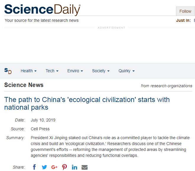 美國每日科學(xué)網(wǎng)(Science Daily)于7月10日以“中國生態(tài)文明之路以國家公園為起點”為題,轉(zhuǎn)載了該文章的部分內(nèi)容。