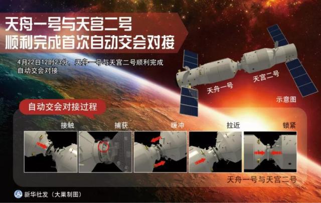 2017年4月22日,天舟一號與天宮二號順利完成首次自動交會對接。