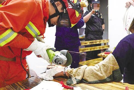 據(jù)了解,女子是被單只手銬卡住了左手,幸運的是手銬卡得不是太緊,為救援創(chuàng)造了有利條件。手銬是金屬材質的,且僅有一厘米寬,救援人員決定用打磨機進行切割。