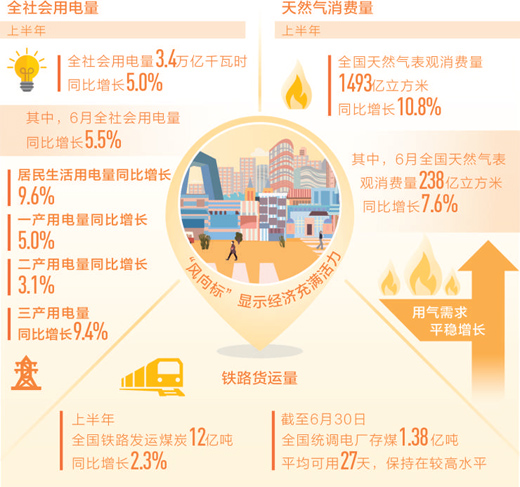 看鐵路貨運量。上半年,全國鐵路發(fā)運煤炭12億噸,同比增長2.3%。截至6月30日,全國統(tǒng)調電廠存煤1.38億噸,平均可用27天,保持在較高水平。