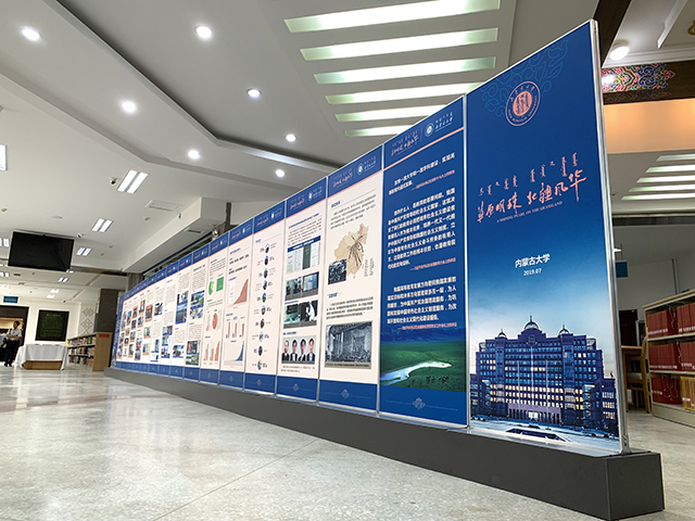 △以“草原明珠、北疆風(fēng)華”為主題的內(nèi)蒙古大學(xué)校史展板。(央視記者邢彬拍攝)