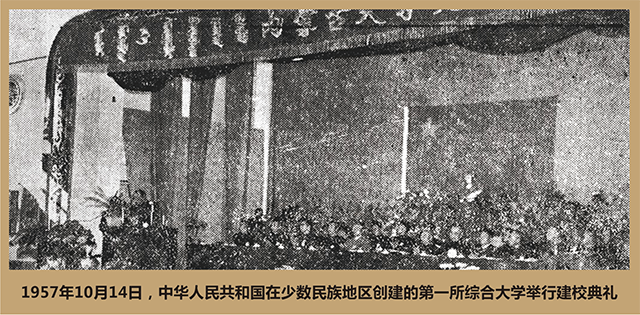 △建校典禮上,烏蘭夫說:“內(nèi)蒙古大學(xué)的建成,是祖國大家庭各民族親密團結(jié)、友愛合作的結(jié)果?!保▋?nèi)蒙古大學(xué)提供)