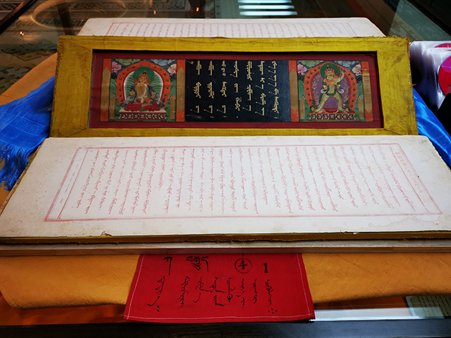 △《甘珠爾經(jīng)》是研究佛學(xué)、哲學(xué)、語言、文學(xué)、醫(yī)學(xué)、天文、藝術(shù)、翻譯學(xué)、民族文化交流等方面的重要文獻,被稱為蒙古文的百科全書。甘珠爾是“ganjuur”的音譯,意為“佛語”。內(nèi)蒙古大學(xué)圖書館藏版本,是目前世界上最完整的版本。 (央視記者張曉鵬拍攝)