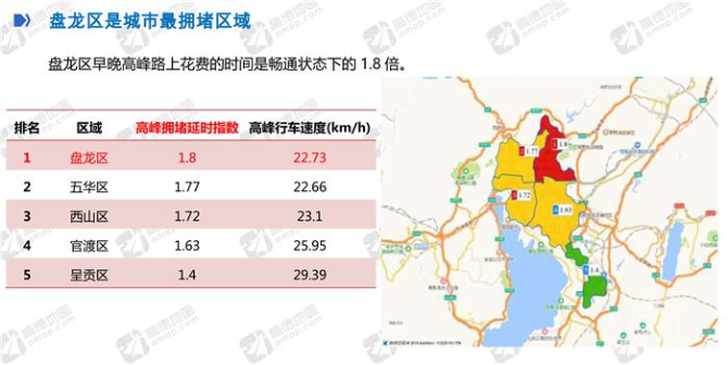 高德交通大數(shù)據(jù)顯示,昆明市二季度有1天的出行時(shí)間是暢通下的2倍以上;6月13日是本季最擁堵的一天,高峰擁堵延時(shí)指數(shù)達(dá)2.26。盤龍區(qū)是城市最擁堵區(qū)域,早晚高峰路上花費(fèi)的時(shí)間是暢通狀態(tài)下的1.8倍,18:00是一天中最擁堵的時(shí)刻。