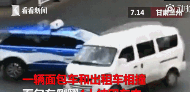 據(jù)蘭州晚報報道,7月14日早上7時19分,在蘭州市定西路與嘉峪關路十字,一輛自南向北行駛的出租車與一輛自西向東行駛的面包車在十字交匯處相遇,面包車被出租車攔腰撞翻,側翻在地。