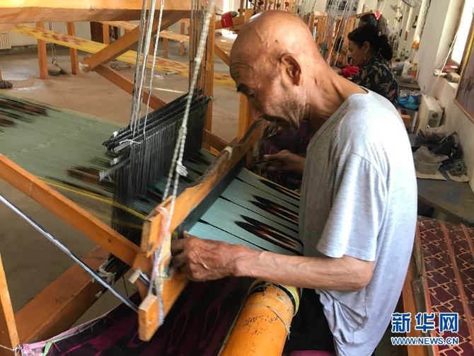 年逾70的艾德萊斯第五代傳承人腳踩踏板,手持木梭,在織布機(jī)前有序地上下翻飛。