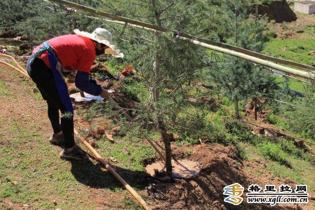 7月17日,記者在香格里拉市建塘鎮(zhèn)諾西村大興組壇布山(行政中心后方)看到,原本荒蕪的山坡已經(jīng)綠意盎然,一棵棵剛?cè)胪恋臉涿缤α⒃诔?yáng)中,香格里拉市大自然園林花卉有限責(zé)任公司的員工們正忙著在山坡上搬運(yùn)樹苗、澆水、架設(shè)護(hù)欄。