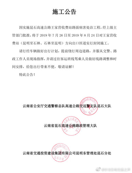 近日,云南省交投昆明東管理處發(fā)布施工公告:因?qū)嵤├ナ咚俟吠跫覡I收費站路面病害處治工程,經(jīng)上級主管部門批準,7月26號至8月24號對王家營收費站(昆明至石林)雙向出口匝道實行封閉施工。