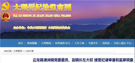 據(jù)云龍縣紀(jì)委監(jiān)委消息:云龍縣漕澗鎮(zhèn)黨委委員、副鎮(zhèn)長左大權(quán)涉嫌嚴(yán)重違紀(jì)違法,目前正接受紀(jì)律審查和監(jiān)察調(diào)查。