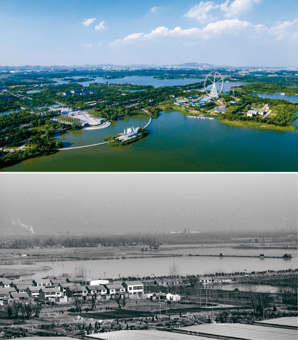 “不要污染的GDP”,向落后產(chǎn)能宣戰(zhàn),成為江蘇高質(zhì)量發(fā)展的鮮明導(dǎo)向。位于江蘇省徐州市賈汪區(qū)的馬莊村曾是一個(gè)典型的采煤村,因過(guò)度開(kāi)采,該村周邊一度是徐州最大的采煤塌陷區(qū)。近年來(lái),當(dāng)?shù)叵聸Q心治理生態(tài)環(huán)境,將村旁的潘安采煤塌陷區(qū)改造為潘安湖國(guó)家濕地公園。上圖為美麗的潘安湖國(guó)家濕地公園,下圖為馬莊村舊貌。 新華日?qǐng)?bào)社供圖