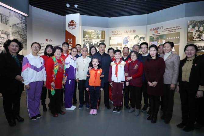 △2019年1月17日上午,習(xí)近平走進天津市和平區(qū)新興街朝陽里社區(qū)志愿服務(wù)展館,同志愿者們親切交流