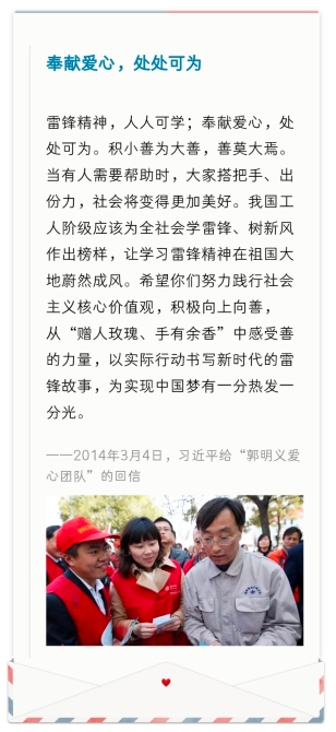 2013年到2014年間,習(xí)近平曾經(jīng)在一年之內(nèi)三次給志愿者團隊回信,點贊他們奉獻、友愛的志愿精神,同時勉勵他們用實際行動書寫新時代雷鋒故事,為實現(xiàn)中國夢作出更大貢獻。