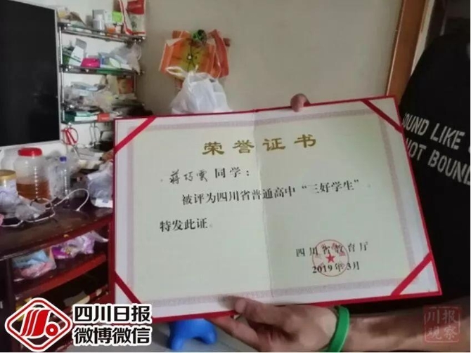 而三個孩子也十分刻苦,在今年3月,蔣巧云被四川省教育廳評為四川省普通高中“三好學生”。