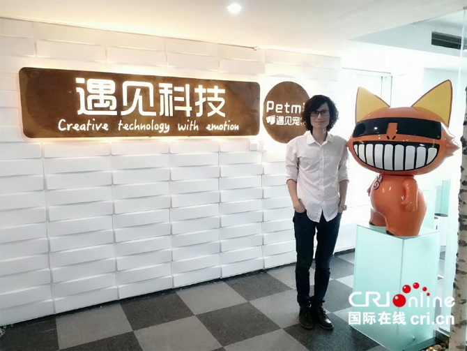 遇見科技,2015年夏天入駐前海自貿(mào)區(qū)。走進(jìn)公司,首先看到的是他們公司的前臺(tái),一頭叫天天的布偶貓和一米高的戴著眼鏡、笑容燦爛的大貓卡通模型,這頭大貓是公司創(chuàng)始人廖玉柯畫的自己。