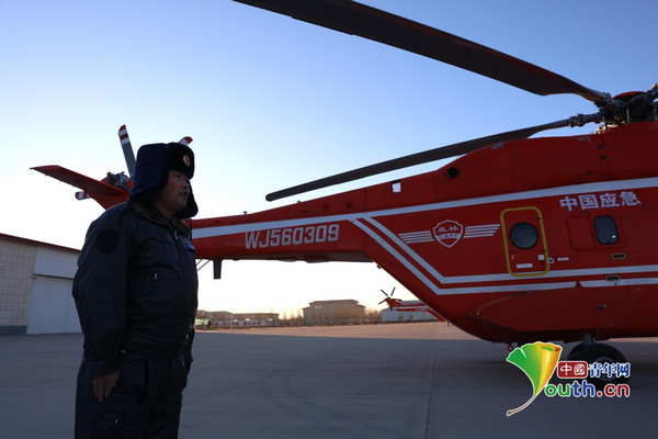 王興坤與應(yīng)急救援直升機(jī)。受訪者供圖
