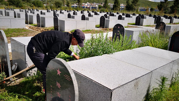這個(gè)季節(jié),每天早晨六點(diǎn)半,羅建國(guó)起床后,就會(huì)來(lái)到離家兩百多米遠(yuǎn)的紅原縣邛溪鎮(zhèn)革命烈士陵園,開(kāi)始清理陵園里瘋長(zhǎng)的野草,擦拭那一座座大理石墓碑和墳塋。