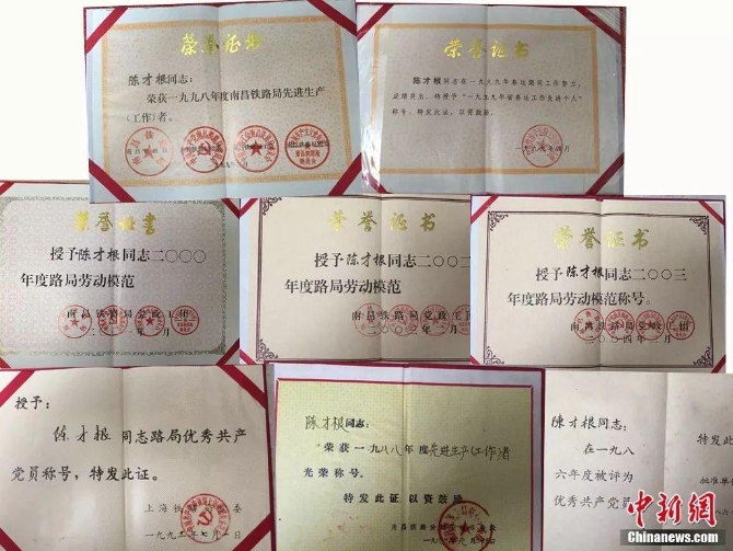 僅1985年以來,陳才根先后25次被原南昌鐵路局評(píng)為先進(jìn)工作者、優(yōu)秀共產(chǎn)黨員、優(yōu)秀黨務(wù)工作者,3次被鐵路局評(píng)為勞動(dòng)模范,4次被江西省評(píng)為春運(yùn)立功先進(jìn)個(gè)人;2002年榮獲原鐵道部授予的“火車頭”獎(jiǎng)?wù)隆f起自己獲得的榮譽(yù)時(shí),古稀之齡的他臉上滿滿都是自豪。