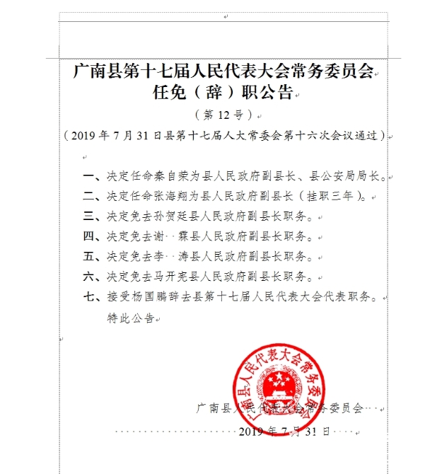 昆明信息港訊 機(jī)器人小明 8月1日,廣南縣發(fā)布第十七屆人民代表大會(huì)常務(wù)委員會(huì)任免(辭)職公告,任命秦自榮為縣人民政府副縣長(zhǎng)、縣公安局局長(zhǎng),具體公告如下: