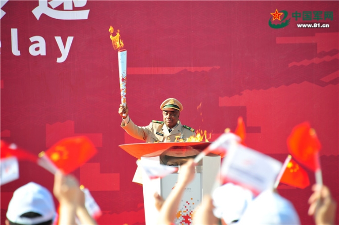 國際軍事體育理事會(huì)秘書長曼比·科伊塔在火炬?zhèn)鬟f儀式現(xiàn)場點(diǎn)燃第一支火炬。鄭文達(dá) 攝