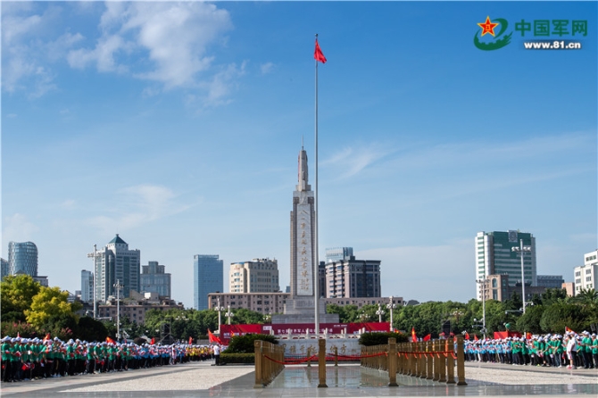 在這軍旗升起的地方,熊熊燃燒的圣火背后,八一南昌起義紀(jì)念塔,形如軍刺,落地成碑。